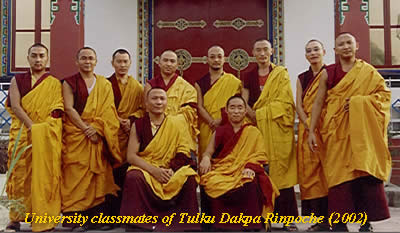 At the age of eight he began his Dharma studies with his father in the village of Dzogchen Monastery, one of the six main monasteries of the Nyingma tradition. There he learned the basic art of reading and writing in Tibetan and many ritual sadhanas, such as Kunchok Shindu and Karling Shitro, or hundred wrathful and peaceful deities, a terma revealed by Karma Lingpa. At the age of eighteen he enrolled at the Mindrolling Monastery in Dehra-dun, India, blessed by H.H. Mindrolling Trichen Rinpoche and H.E. Kho chhen Rinpoche. Mindrolling Monastery is the source or mother monastery of the whole Nyingma tradition. He was ordained a Getshul by H.E. Mindrolling Khenchen Rinpoche. Tulku Dakpa Rinpoche graduated from Ngagyur Nyingma College, the shedra of Mindrolling Monastery, as a certified holder of both sutrayana and tantrayana after studying there for nine years. In the course of his studies he studied the common knowledge of history, poetics and valid cognition, as well as the uncommon knowledge of the Indian and Tibetan masters' commentaries on the vinaya-, sutra- and abhidharma pitakas of Buddha's three vehicles of teachings. Moreover he studied many texts on the great tantric knowledge, such as Guhyagarbhatantra commentaries by the great masters Lochen Dharmash ri and Kunkhyen Longchen Rabjam and Dzogpa Chenpo Semnyid Ngalso, or Great Perfection: the Nature of Mind, Easer of Weariness by Kunkhyen Longchen Rabjam. During his nine years there he received most of the teachings from Khenchen Tshewang Rigzin, late Khe npo Jampal Tshering, and from many other khenpos in the college. During his studies he taught the history of Buddhism, poetics, valid cognition, madhyamika etc. to other classes in the college, following a dictate of the college's khenpos. He was also the first editor of the Minling Editorial Committee for three years. During Rinpoche's editorship the committee edited The History of the Mindrolling Lineage and Ethical Rules of the College.